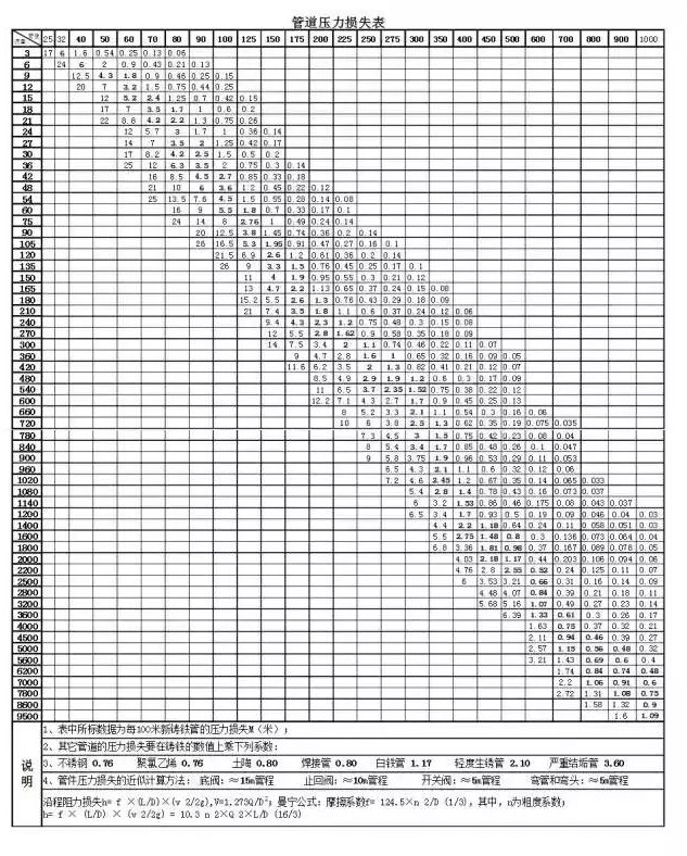 沿程損失與管壁粗糙度有關的沿程摩擦系數成正比關系,不同的管材其粗糙度不同,鑄鐵管比較粗糙,沿程摩擦系數就大些;塑料管比較光滑,沿程摩擦系數就小些。與管子長度成正比關系;與管徑成反比關系,就是說,當流量一定時,管徑小、流速快,則沿程損失大;還與流速的平方值成正比關系。當然計算比較繁瑣,簡單的方法可以估算。