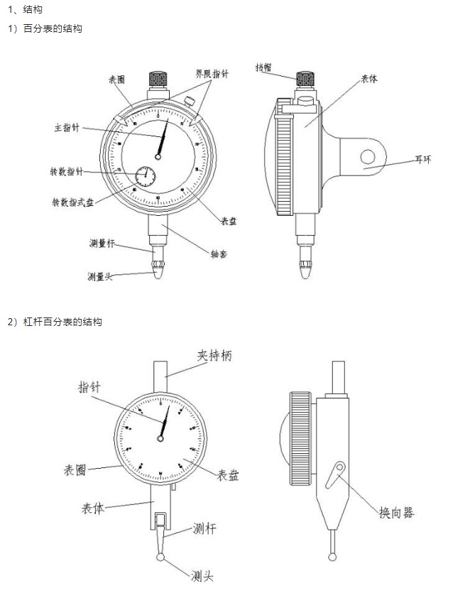 帶有測頭的測量桿,對刻度圓盤進行平行直線運動,并把直線運動轉變為回轉運動傳送到長針上,此長針會把測桿的運動量顯示到圓型表盤上。