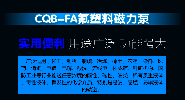 氟塑料磁力泵又稱其為氟塑料磁力離心泵、襯四氟磁力泵、氟塑料磁力驅動泵、耐腐蝕磁力化工泵,CQB-FJ襯氟磁力泵是我公司氟塑料磁力泵中的全新升級款型。氟塑料磁力泵另有:CQB-