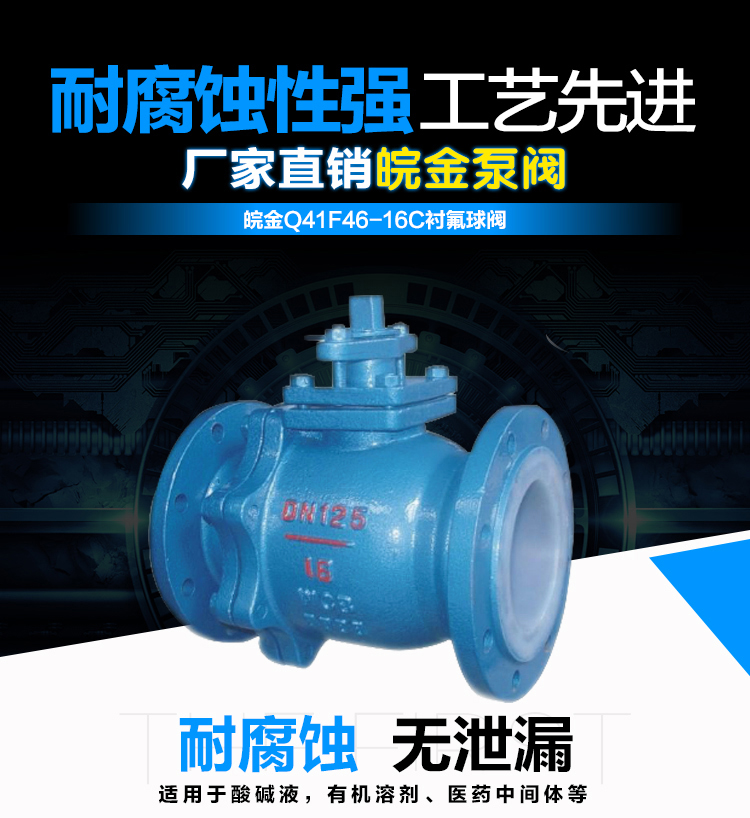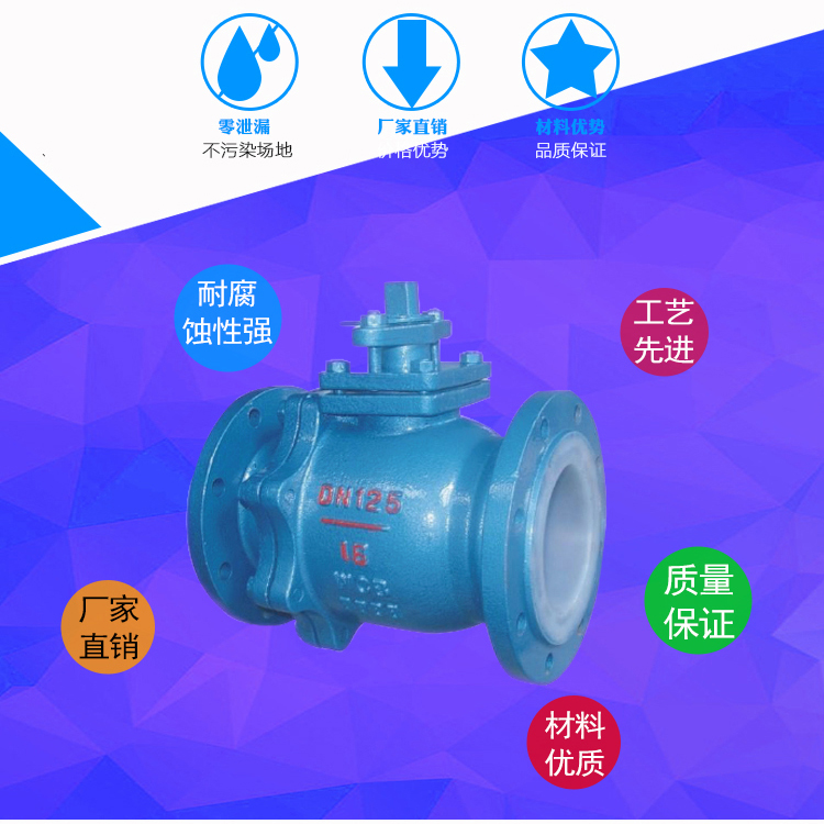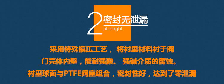 采用特殊模壓工藝, 將襯里材料襯于閥門殼體內壁,能耐強酸、 強堿介質的腐蝕。 襯里球面與PTFE閥座組合,密封性好,達到了零泄漏。