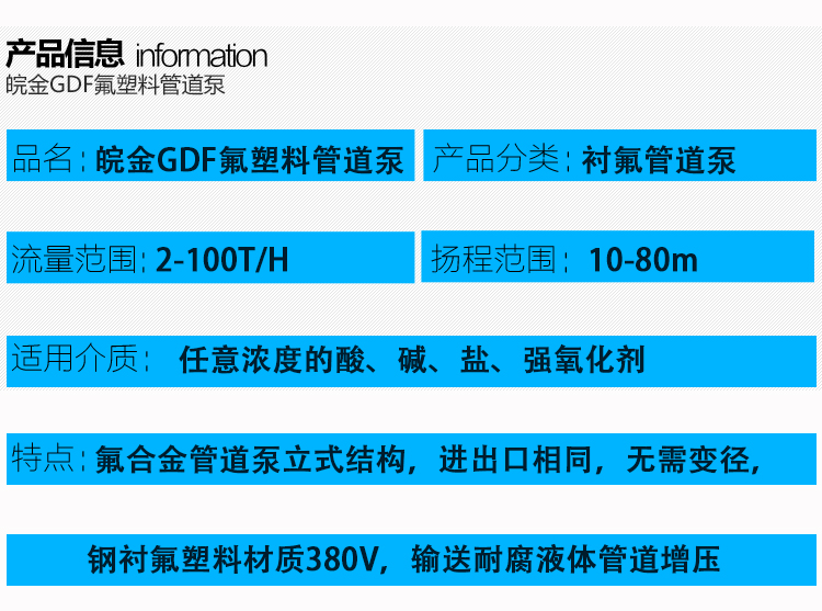 GDF氟塑料管道泵是耐腐蝕化工離心泵中的一種立式結構形式的泵,安裝維護方便(維護葉輪、泵體、軸承時可以不拆除管道)、性能范圍廣、成熟等優勢。耐腐蝕管道泵和耐酸堿管道泵,作為耐腐蝕泵中的氟塑料材質泵在耐腐蝕性上的表現,氟塑料管道泵以襯氟管道泵得到大多數工況企業的青睞。