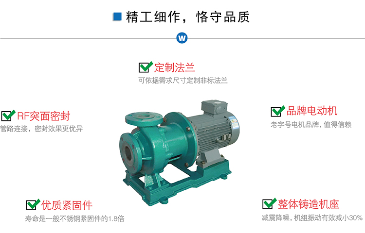 功能上:由于以上的結構設計,材料配置,CQB-FJ系列磁力泵,可輸送含濃度的腐蝕性液體、高溫強酸強堿等。