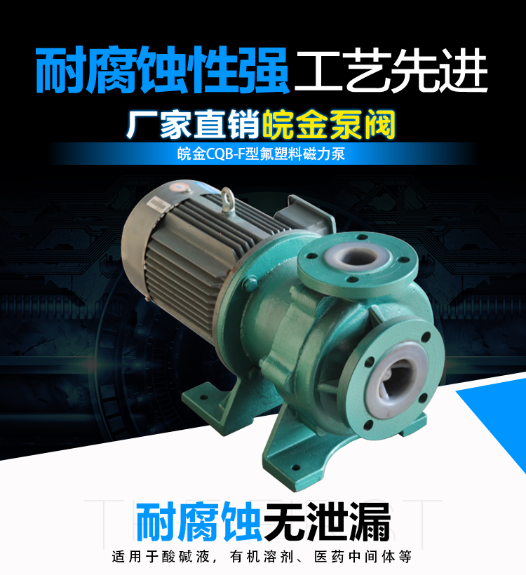 CQB-FJ氟塑料耐腐蝕磁力泵俗稱磁力驅動泵,其中非金屬材質耐腐蝕磁力泵應用廣泛,非金屬材質中氟塑料磁力泵,襯氟磁力泵其過流部件采用氟塑料及高純度工業陶瓷制成,具有優異的耐腐性及密封性廣泛用于化工、鋁箔、制酸、涂裝、有色金屬等行業及易揮發、有機溶劑和貴重液體的輸送。