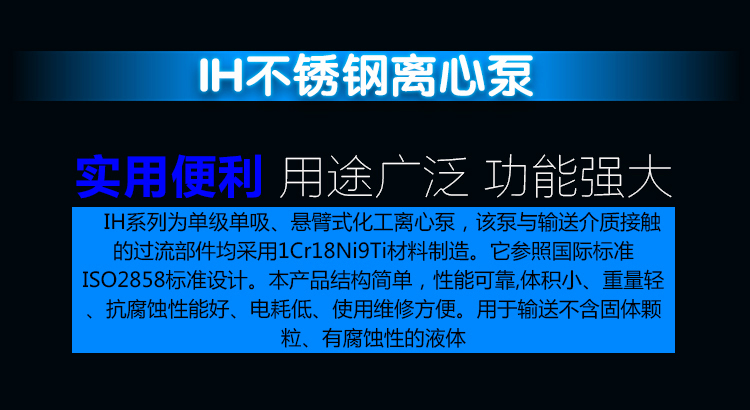 IH不銹鋼耐腐蝕離心泵具備耐腐蝕,高效節能、抗汽蝕性能強,適用溫度范圍廣。具有運行穩定、噪音振動低、可靠性高、壽命長等優點,是堿液、醇類、各種有機溶劑等介質的輸送設備。