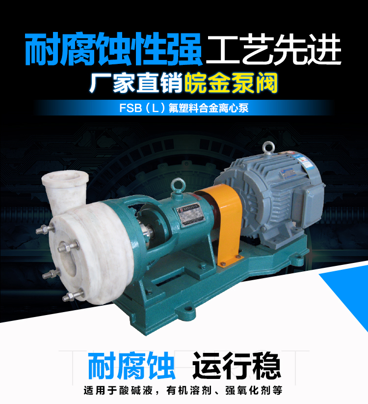 FSB-L和FSB-D型離心泵,過流部件采用氟塑料合金制造,結構緊湊.操作簡單、價格低廉。泵體、葉輪、泵蓋采用金屬嵌件外包氟塑料壓制成型。兩種型號的泵殼、葉輪、機封等均可互換使用, 因此深受用戶的歡迎。