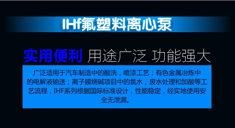 IHF-J 耐腐蝕氟塑料離心泵廣泛應用于汽車制造的酸洗工藝、制酸制堿、噴漆工藝、有色金屬冶煉中的電解液輸送、離子膜項目中的氯水輸送、廢水處理、電鍍、化工行業、鋼鐵冶金、造紙行業等。
