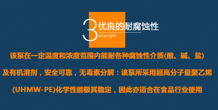 5、安全可靠,無毒素分解:該泵所采用超高分子量聚乙烯(UHMW-PE)化學性能極其穩定,因此亦適合在食品行業使用。
