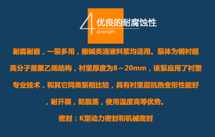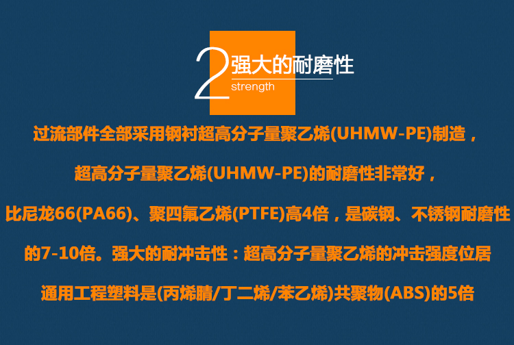 1、強大的耐磨性:過流部件全部采用鋼襯超高分子量聚乙烯(UHMW-PE)制造,超高分子量聚乙烯(UHMW-PE)的耐磨性,比尼龍66(PA66)、聚四氟乙烯(PTFE)高4倍,是碳鋼、不銹鋼耐磨性的7-10倍。