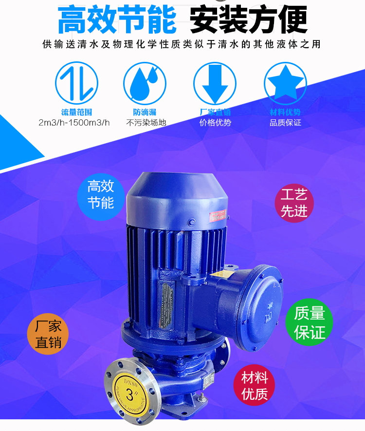WJLG管道泵為立式結構,進出口口徑相同,且位于同一中心線上,可安裝在管路之中,外形緊湊美觀,占地面積小,建筑投入低,如加上防護罩則可置于戶外使用。葉輪直接安裝在電機的加長軸上,軸向尺寸短、泵與電機軸承配置合理,能有效地平衡泵運轉產生的徑向和軸向負荷,從而保證了泵的運行平穩,振動噪音很低。安裝檢修方便面,無需拆動管路系統,只要卸下泵聯體座螺母即可抽出全部轉子部件。可根據管路布置的要求采用泵的豎式和橫式安裝。ISG管道泵分基本型、分流型、切割型,材質可選:鑄鐵、201、304、316L,等多種規格。