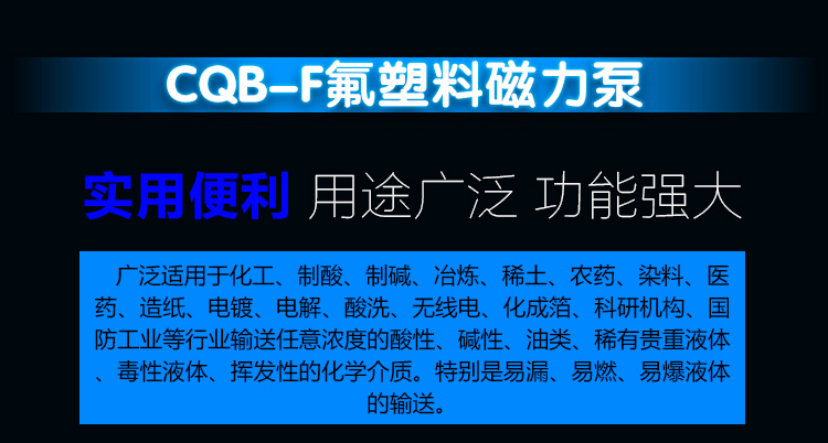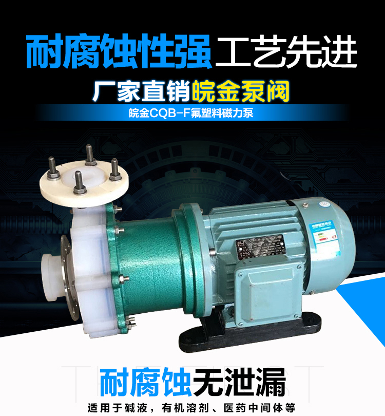 氟塑料磁力泵又稱其為氟塑料磁力離心泵、襯四氟磁力泵、氟塑料磁力驅動泵、耐腐蝕磁力化工泵,CQB-FJ襯氟磁力泵是我公司氟塑料磁力泵中的全新升級款型。氟塑料磁力泵另有:CQB-
