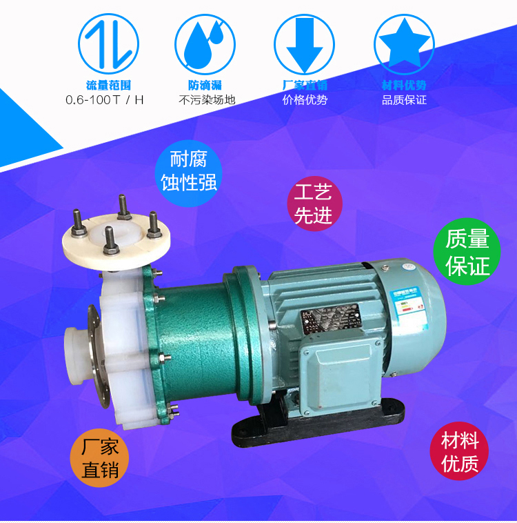 磁力泵俗稱磁力驅動泵,其中金屬材質耐腐蝕磁力泵應用廣泛,非金屬材質中氟塑料磁力泵,襯氟磁力泵其過流部件采用氟塑料及高純度工業陶瓷制成,具有耐腐性及密封性廣泛用于化工、醫藥、鋁箔、制酸、涂裝、有色金屬等行業及易揮發、有機溶劑和貴重液體的輸送。